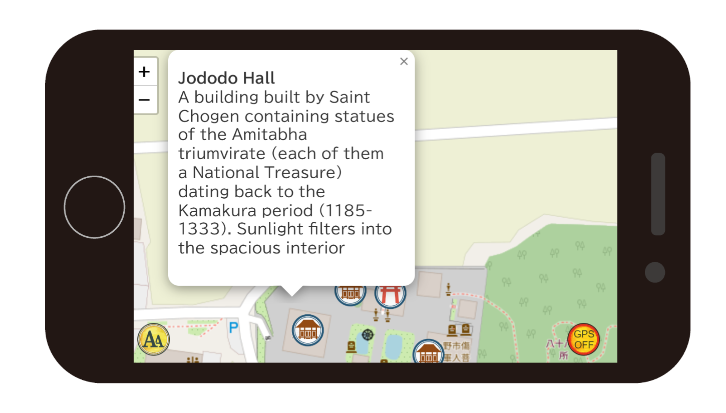 The GPS-linked online map allows you to check the location and basic information of cultural properties. It can also be used to help you find your way to a cultural property you would like to visit.