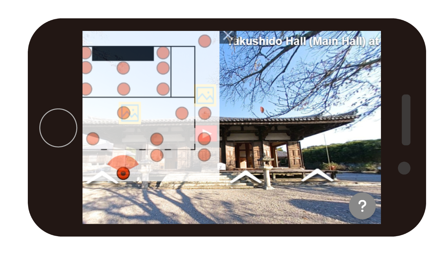 The panoramic virtual viewer is content that links 360° images of Yakushido Hall, Jodoji Temple to create a virtual space that you can navigate to visually understand Yakushido Hall, Jodoji Temple.