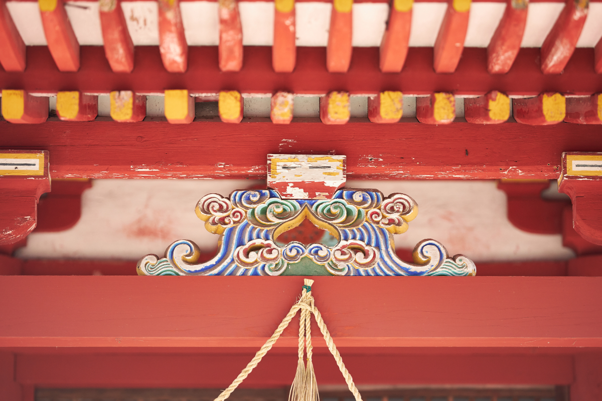 Under the roof are decorations called kaerumata, named so for their resemblance to outstretched frog legs. They are decorated with engravings of flowers, trees, and birds.