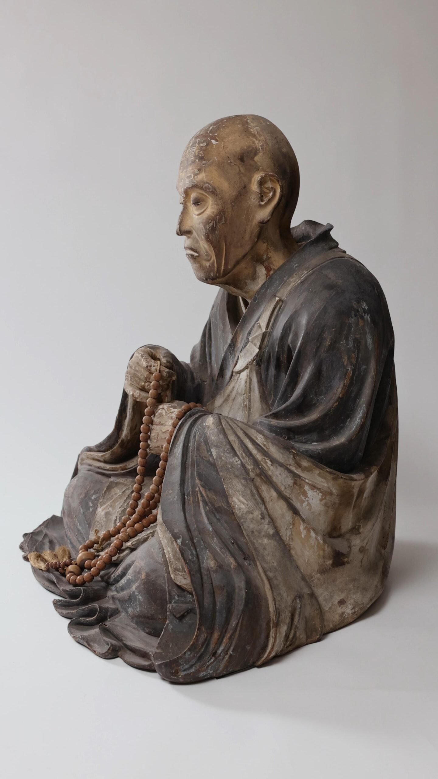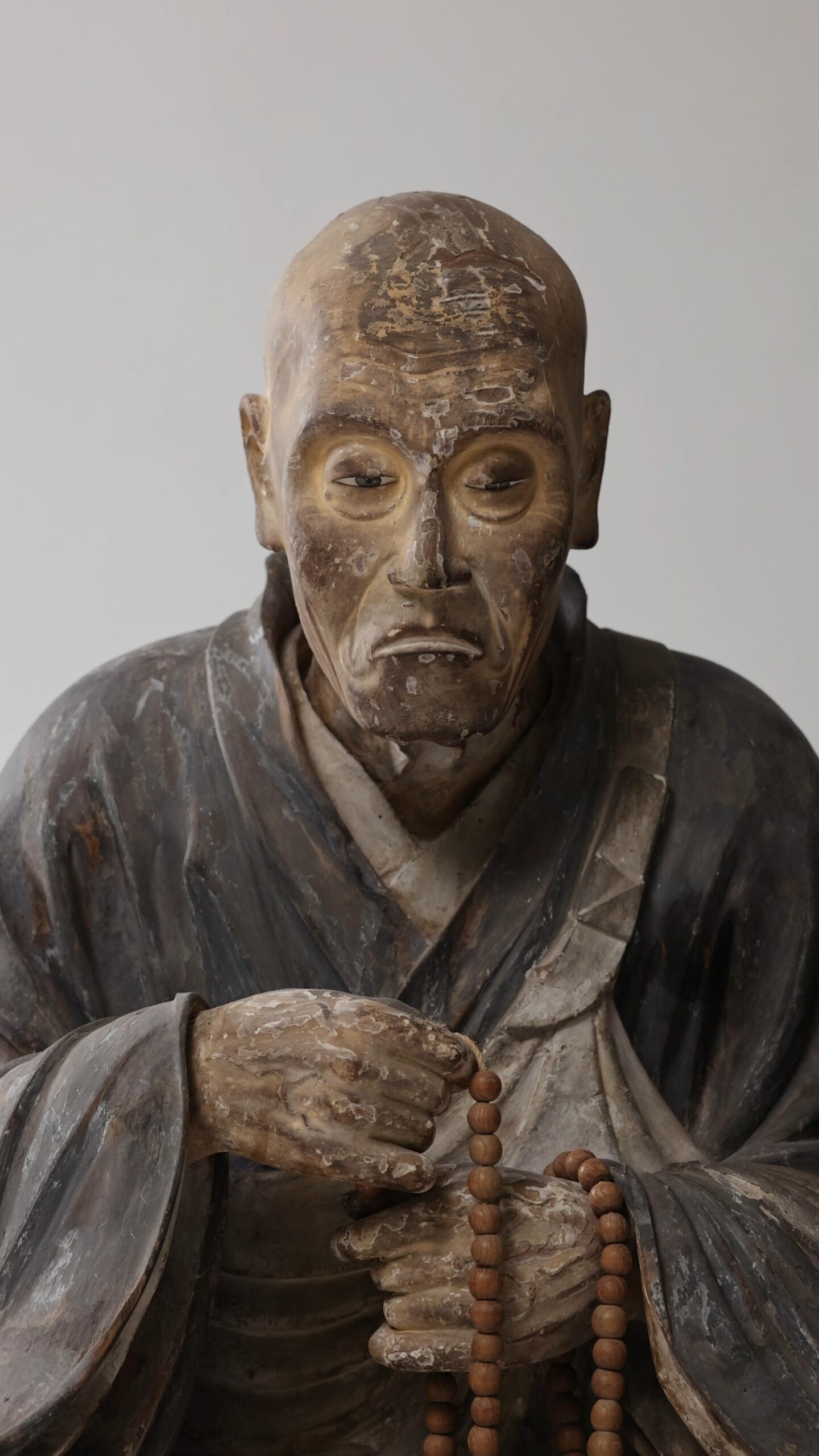 The statue, with a slightly hunched posture and a set of juzu beads held at chest level, is thought to be a copy of a statue of Chogen at Todaiji Temple.